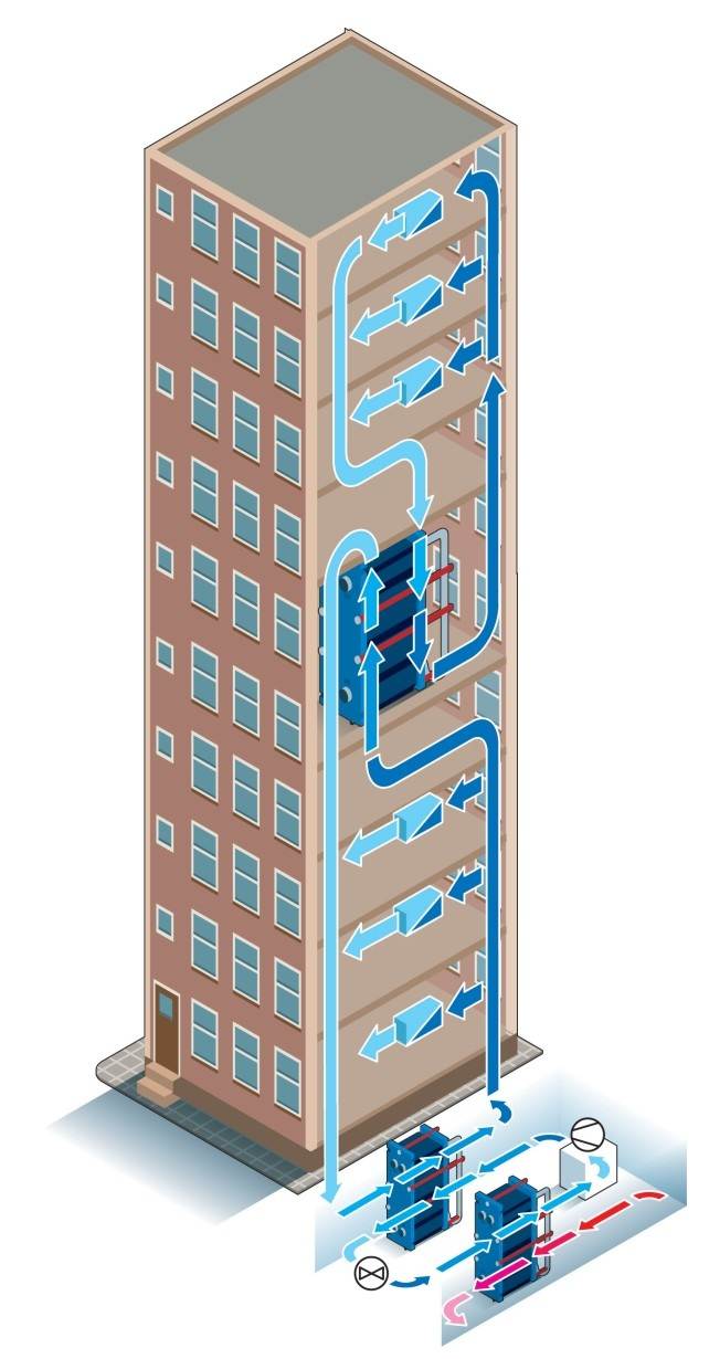 Tùy thuộc vào quy mô của tòa nhà cao tầng, có thể có nhiều bộ trao đổi nhiệt dạng tấm hoạt động như các bộ phân vùng áp suất. Điều quan trọng là phải đảm bảo tránh thất thoát lạnh trong hệ thống làm mát. Công nghệ truyền nhiệt hiệu suất cao của Alfa Laval với phương pháp “tiếp cận gần” đảm bảo gần như toàn bộ công suất lạnh được truyền lên các tầng cao mà không bị tổn thất đáng kể.